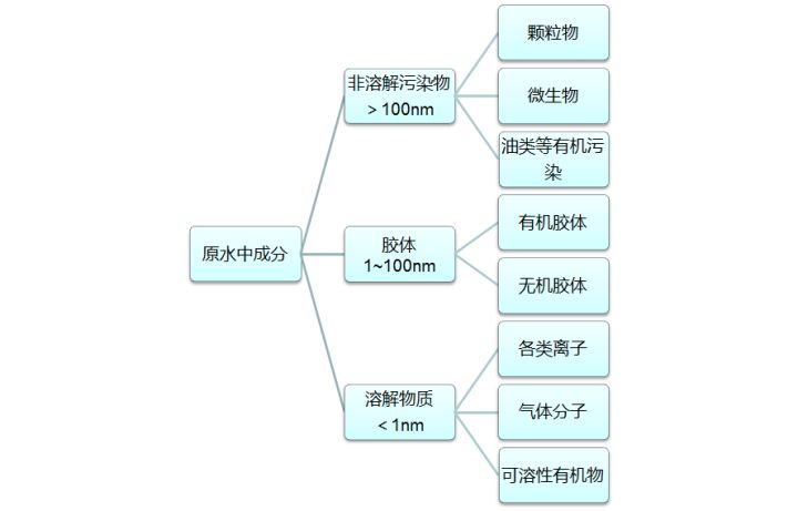 水是極好的分散體,導(dǎo)致通常看到的水里面都含有溶解或非溶解的有機(jī)物和無機(jī)物。去除這些污染物,或者把它們從水中分離出去。按照污染物的尺寸分類將更加有效,這可以關(guān)聯(lián)到我們可以采用何種技術(shù)去去除,比如按如下分類: